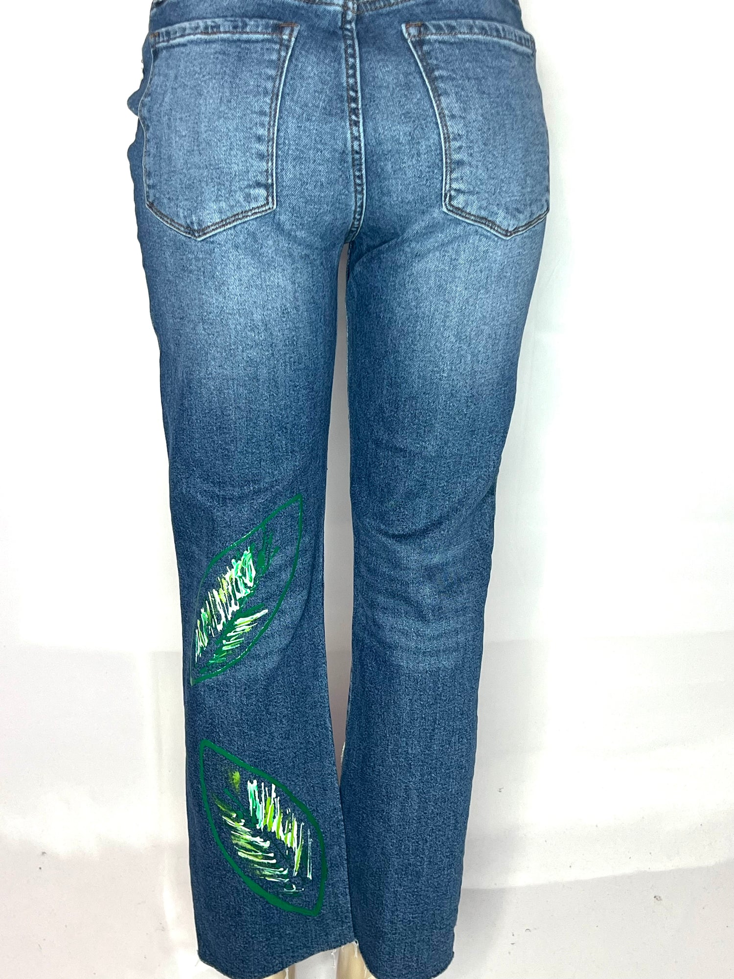 Artful Denim The Rainforest stonewashed straight leg ultra high rise denim large embroidered patches set in large hand painted background 99% cotton 1# spandex