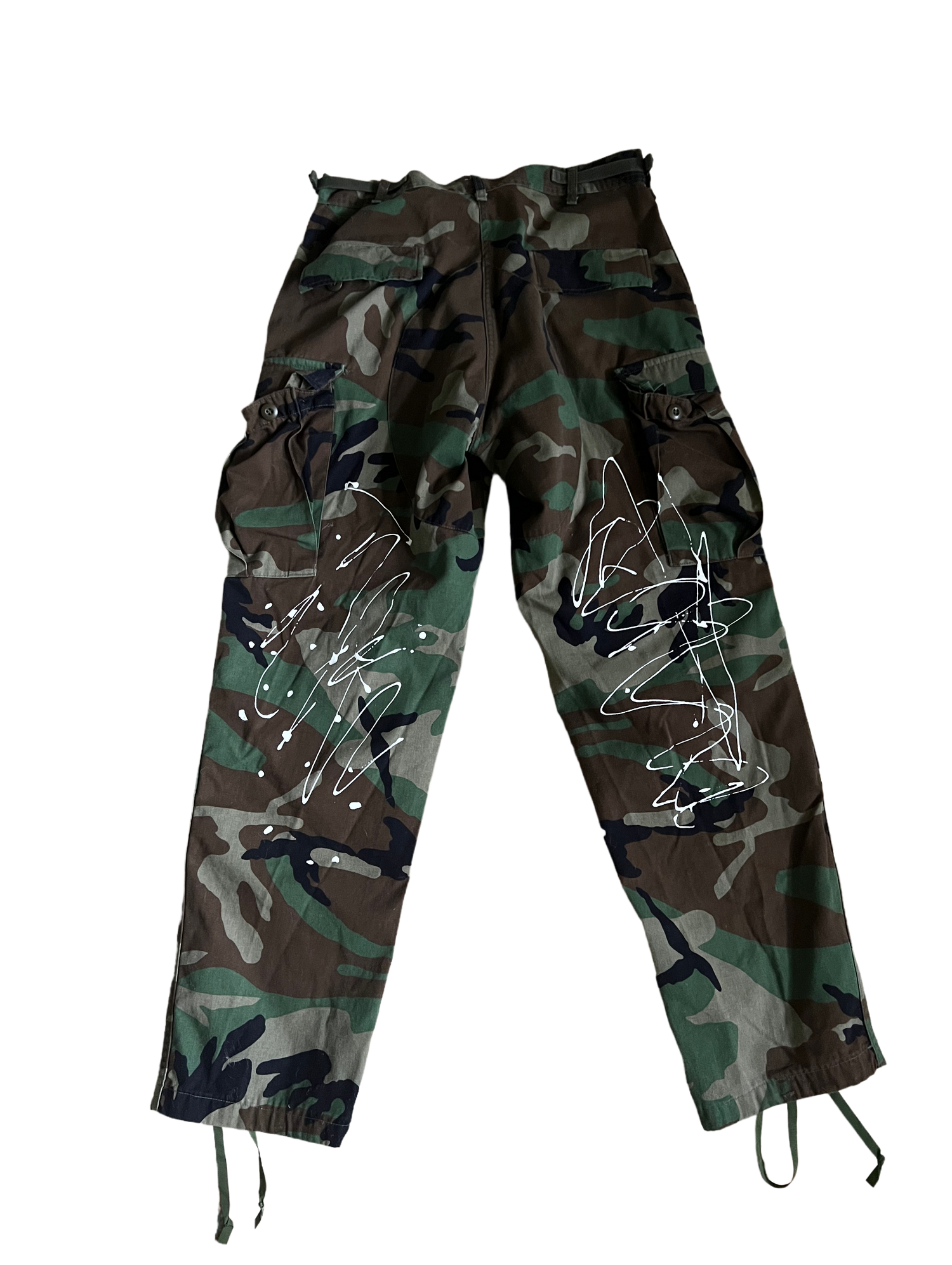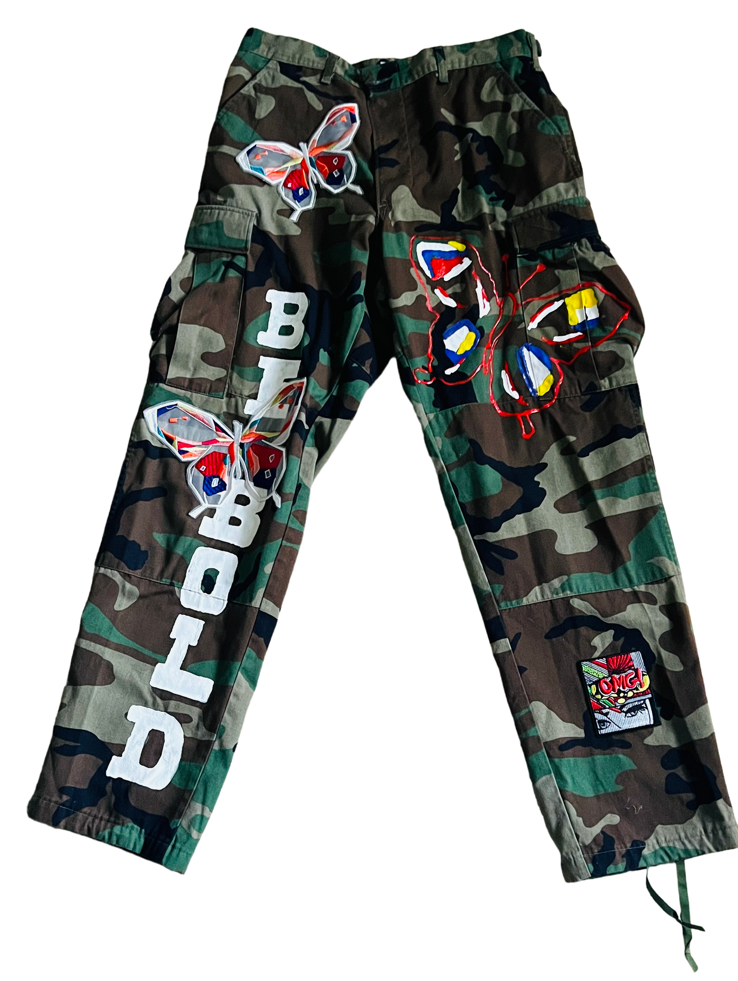 Strut you feathers in this bold expression of camouflage. Hand painted designs set off the colorful butterflies on natural camouflage.