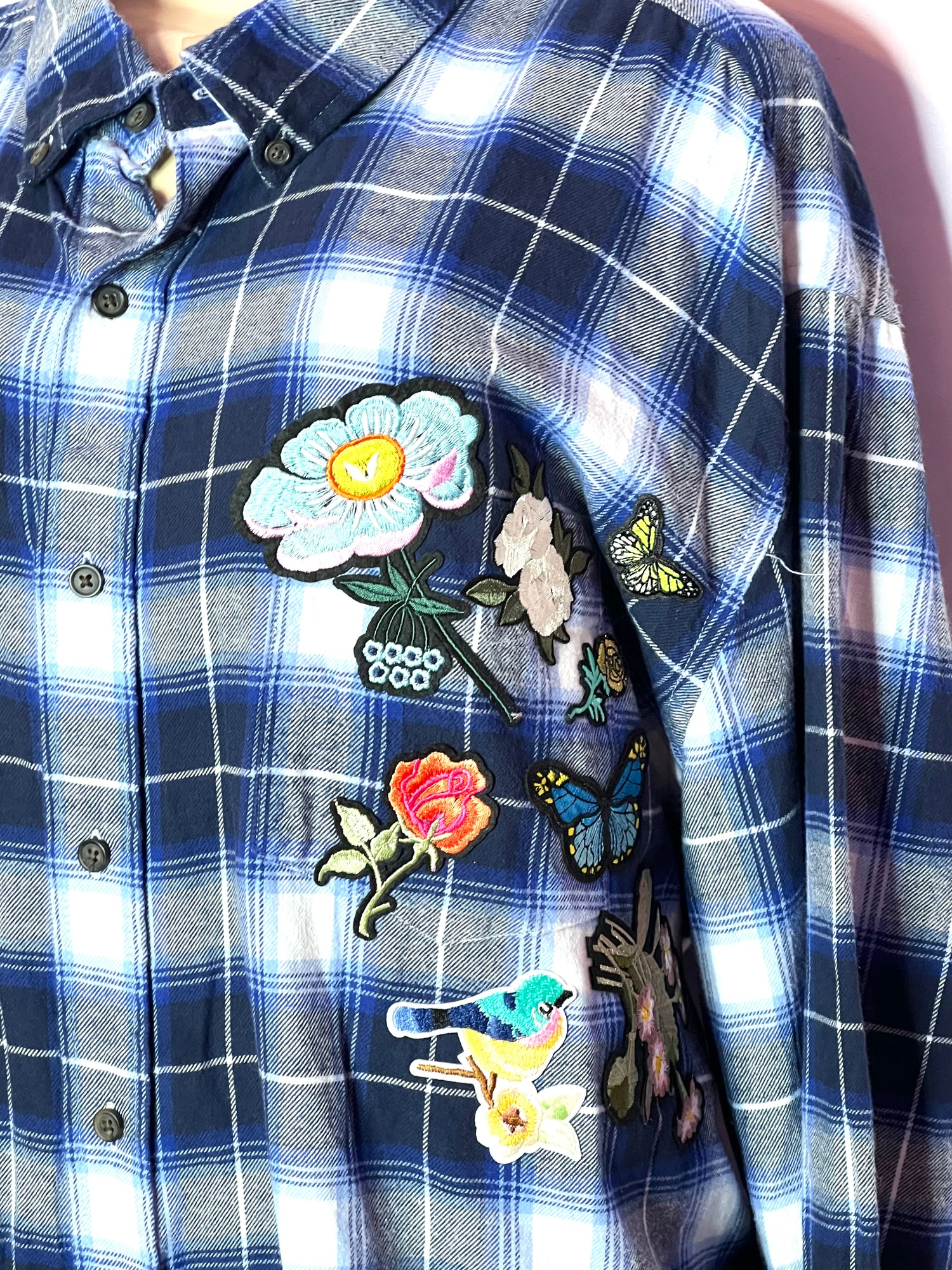 Boho blue plaid oversized patched customer shirt size 3X