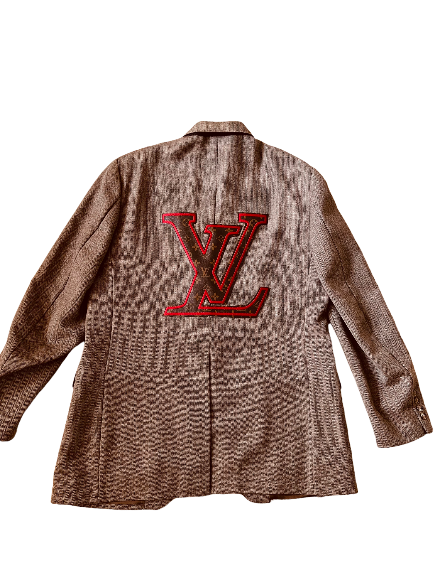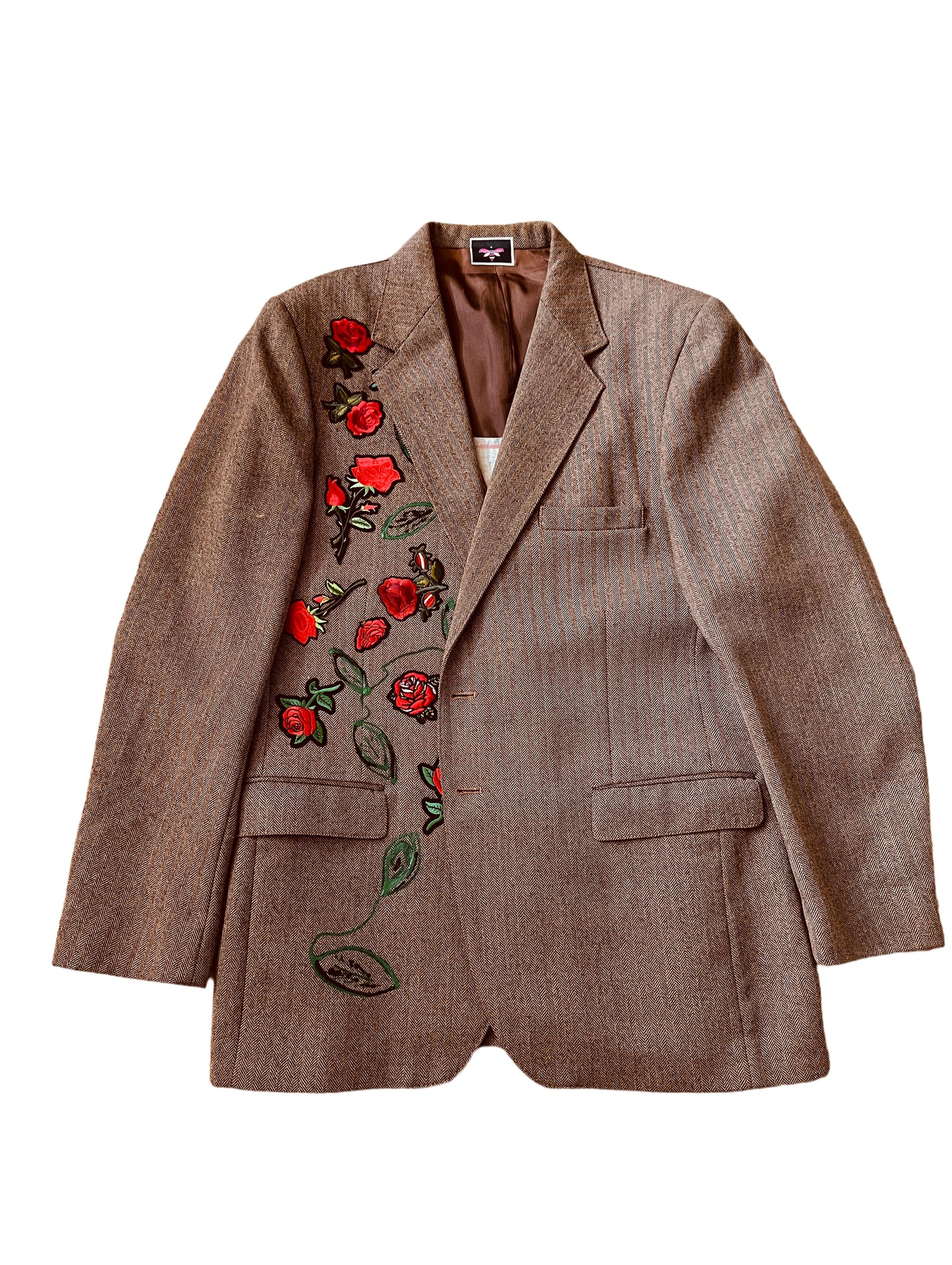 Brown 100% wool blazer accented with red roses and LoVe emblem