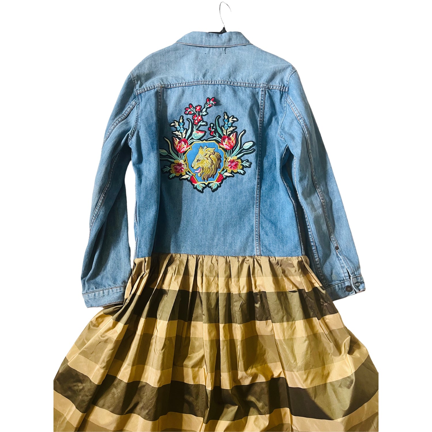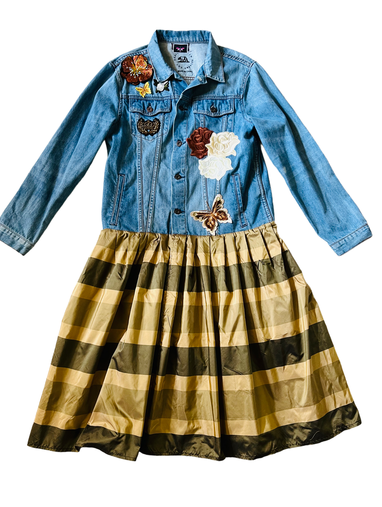 Denim designed with dramatic design of embroidered patches and florals. 100% Cotton top and polyester bottom