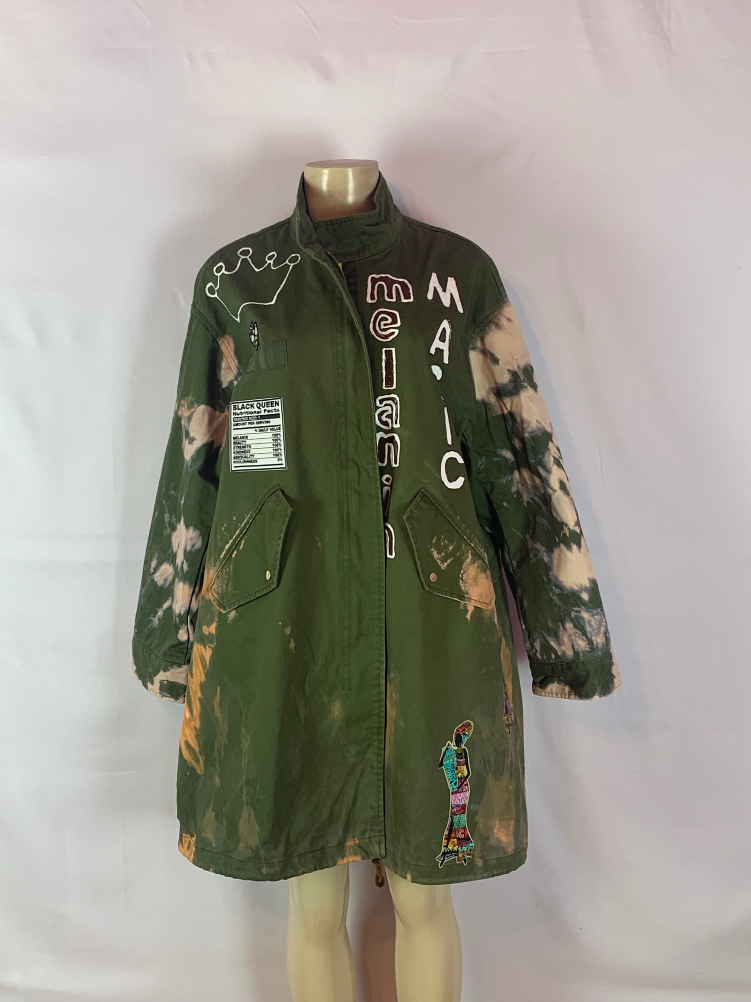 Knee length tie dyed army green “Black Queen” designed with embroidered back