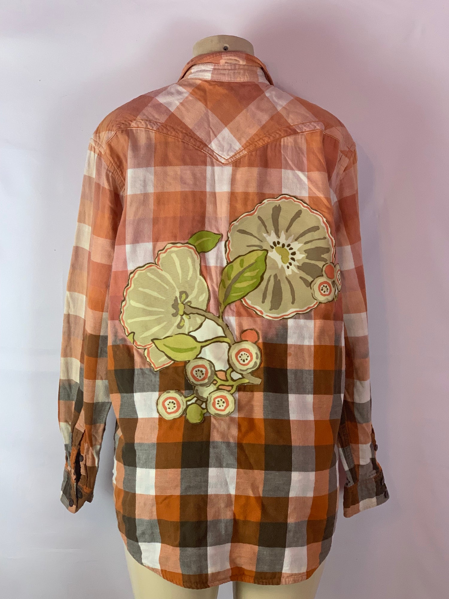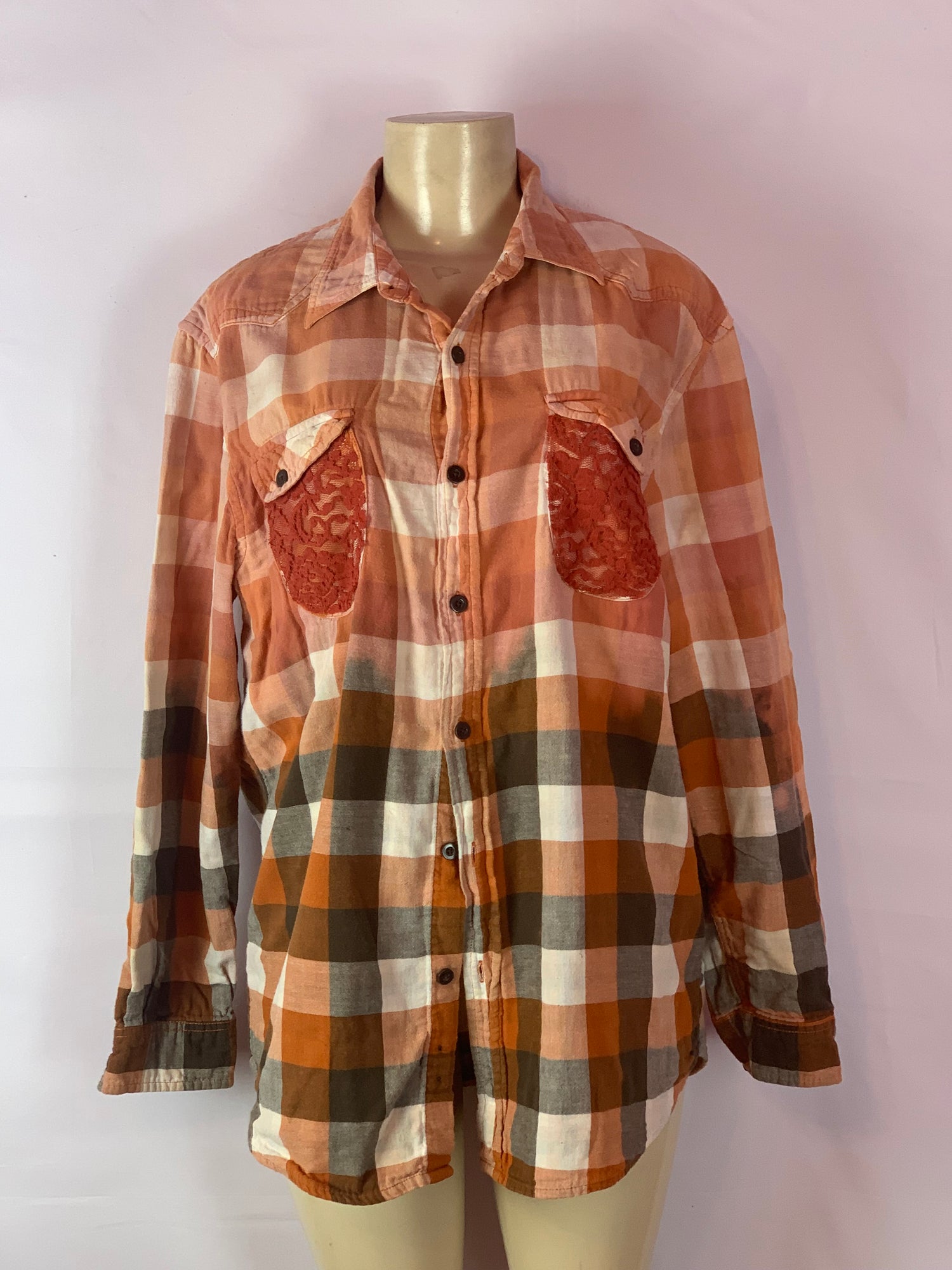 Orangle Flannel plaid dyed shirt with lace accent 100% cotton button down