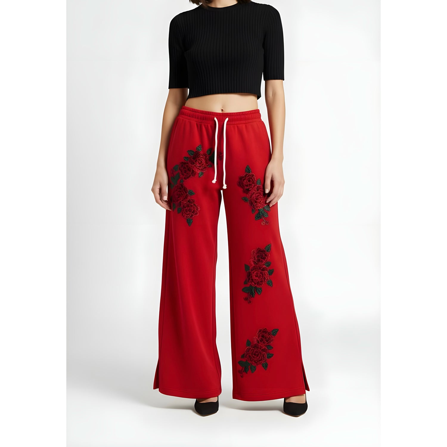 Out From Under red wide leg roll down waist design pant with side pockets. These pants are 100% polyester with elastic waist.