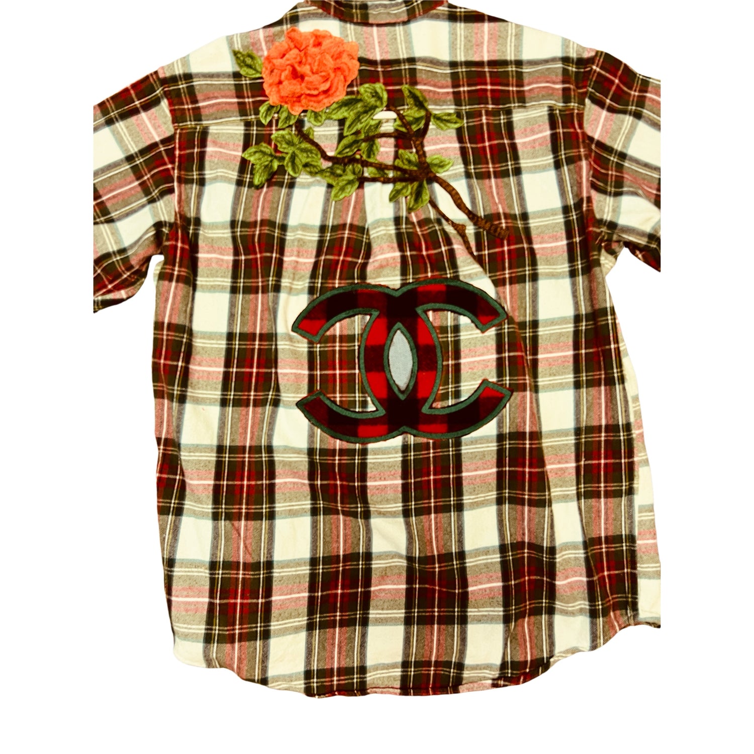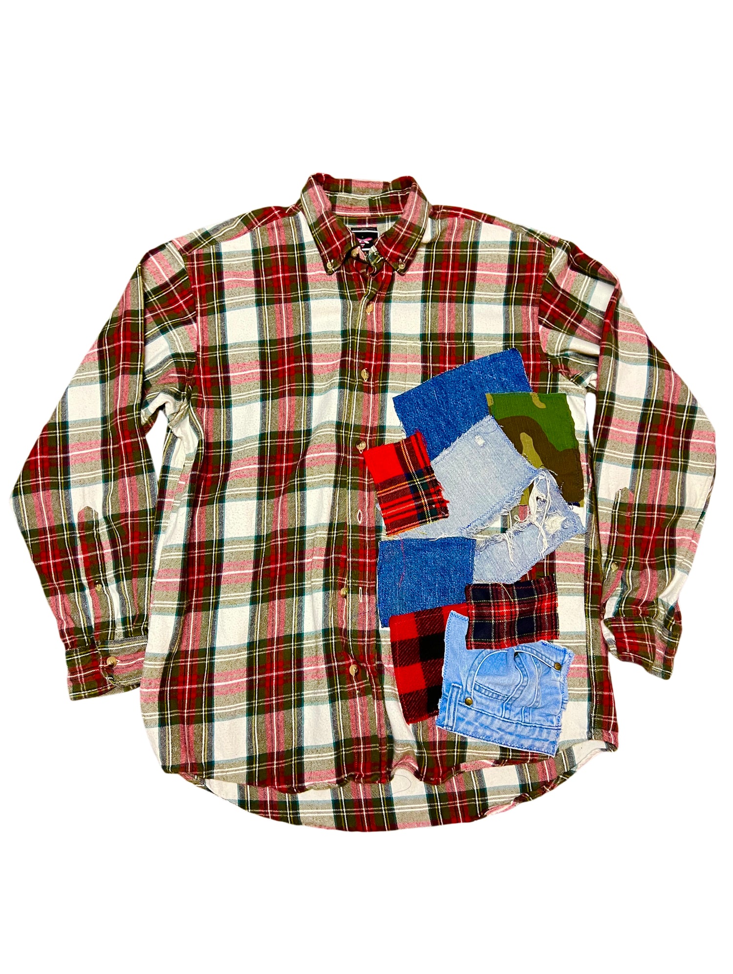 Red in distress plaid long sleeve skirt with patches of denim, plaid, and camouflage accents on back can be worn as jacket or shirt 100% cotton